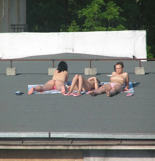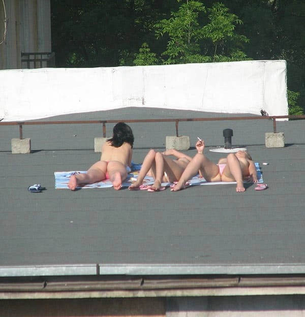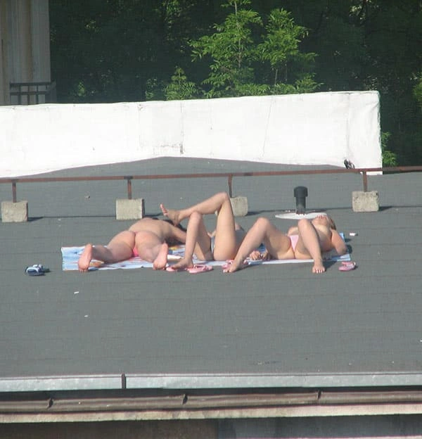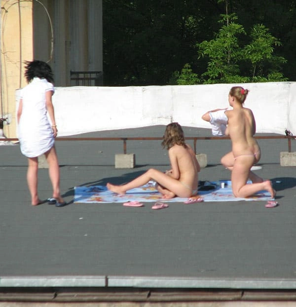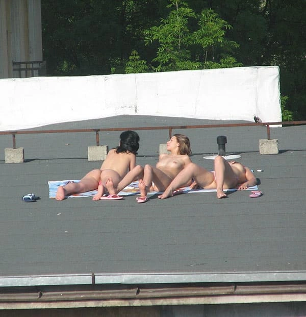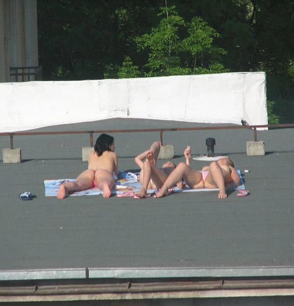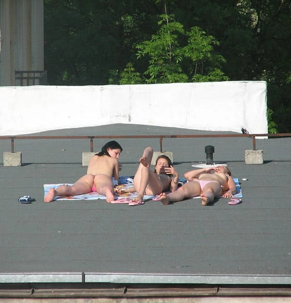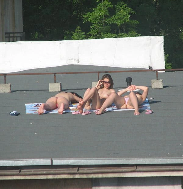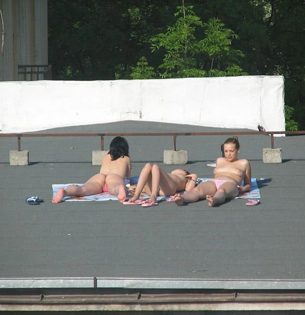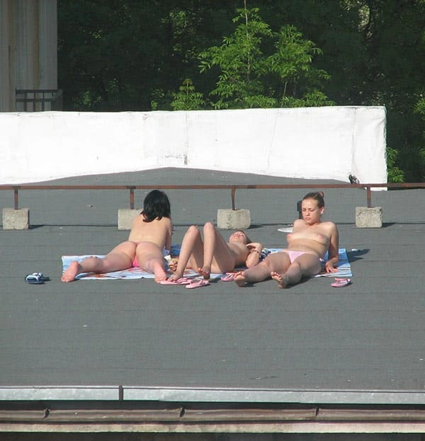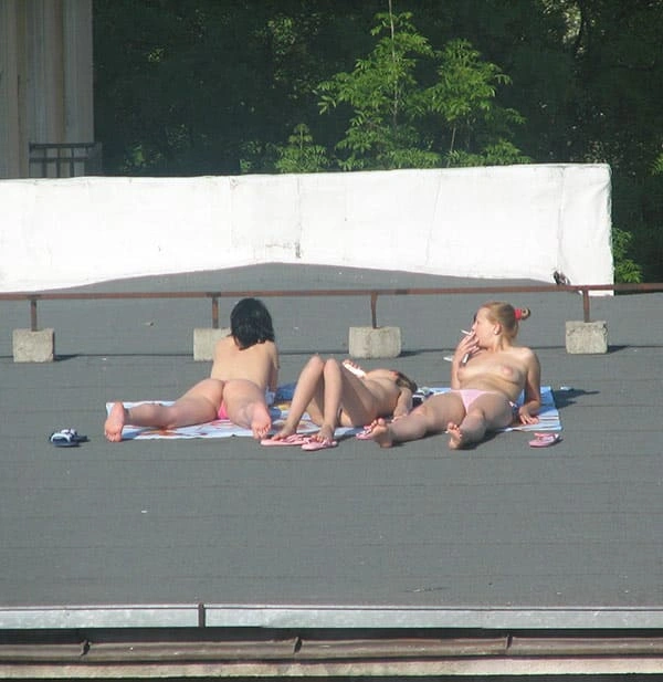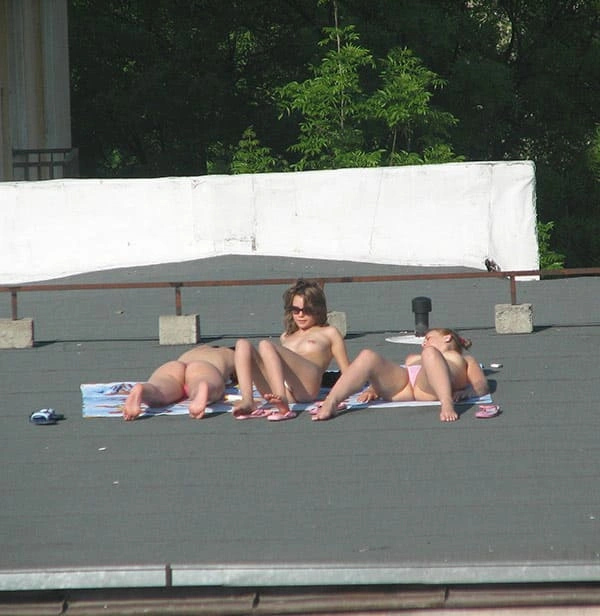 Ты видел это фото, где три русские девушки загорают на крыше? Они в стрингах и с голыми сиськами! Я просто не могу поверить, что они решились на такое. Но признаться, они выглядят просто ошеломительно! Я бы тоже хотела так загорать, но я бы никогда не смогла показаться на всю улицу в таком наряде. Вот это да, смелые девчонки!