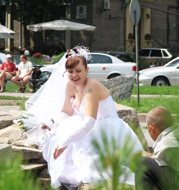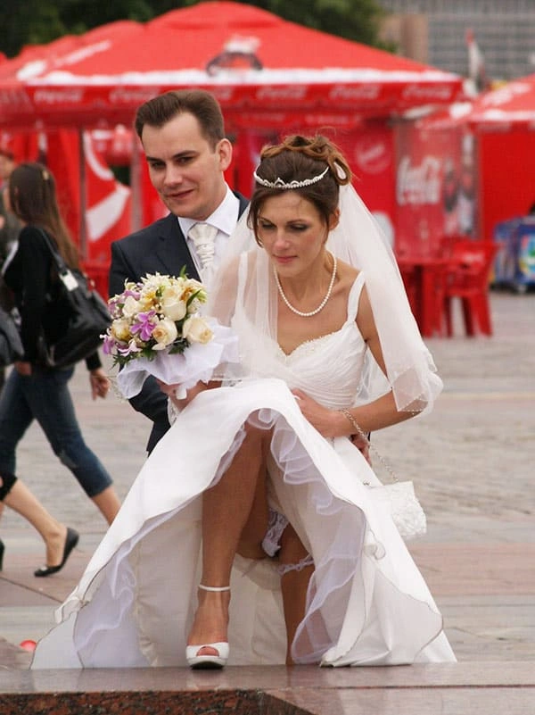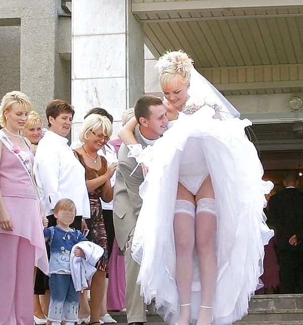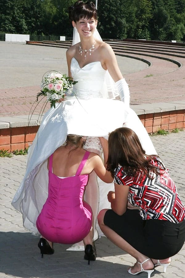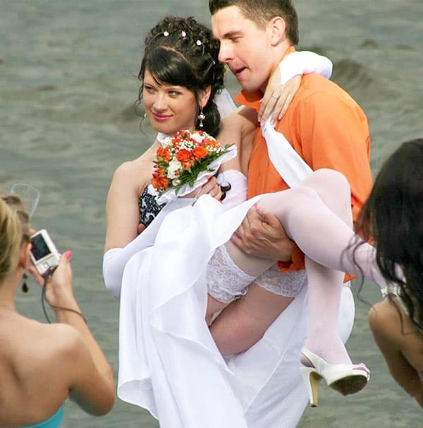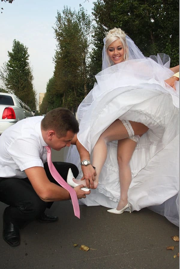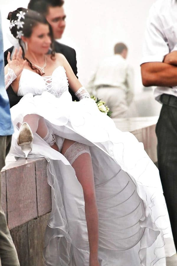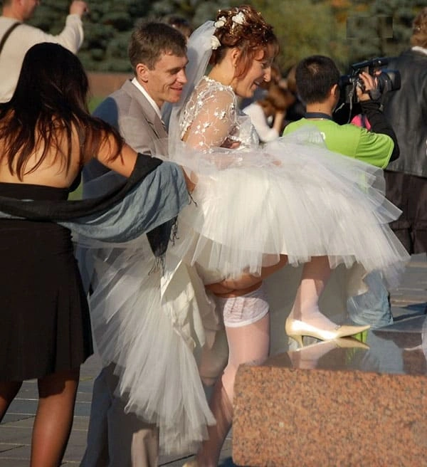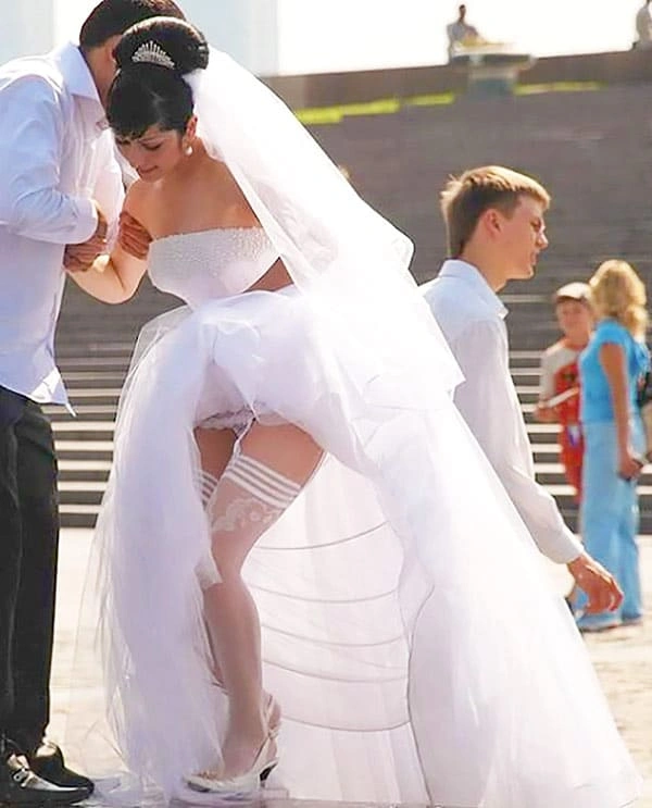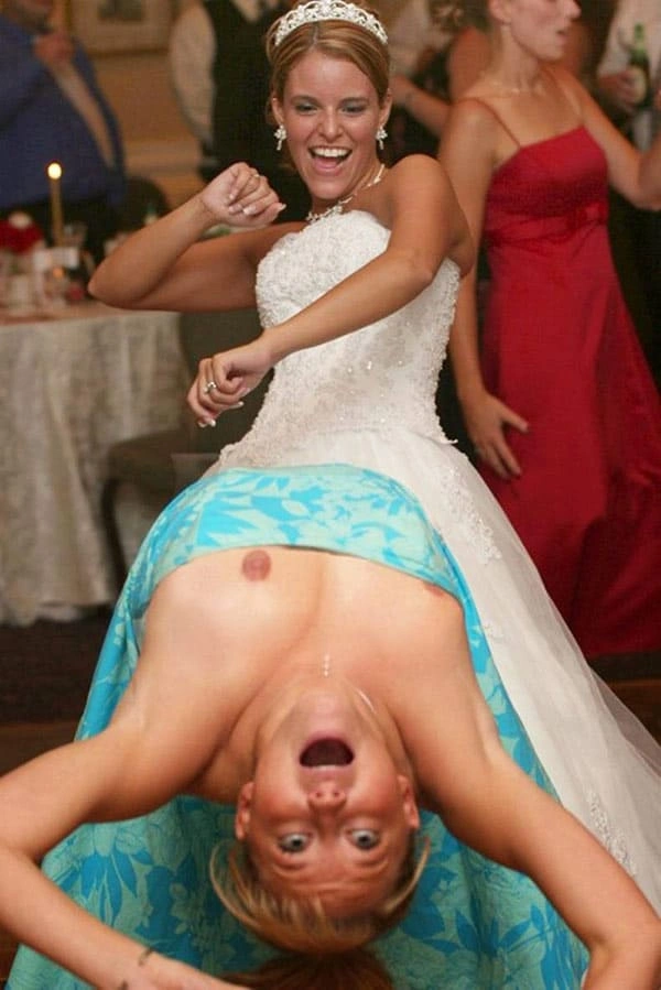 На одной фотке даже парень случайно попал в кадр, пытаясь поднять невесту на руки. Все это выглядит очень смешно и немного пошло, но в то же время очень естественно и отражает настоящую атмосферу свадебного веселья. Наверное, после таких фото молодожены будут смеяться, вспоминая свой особенный день.