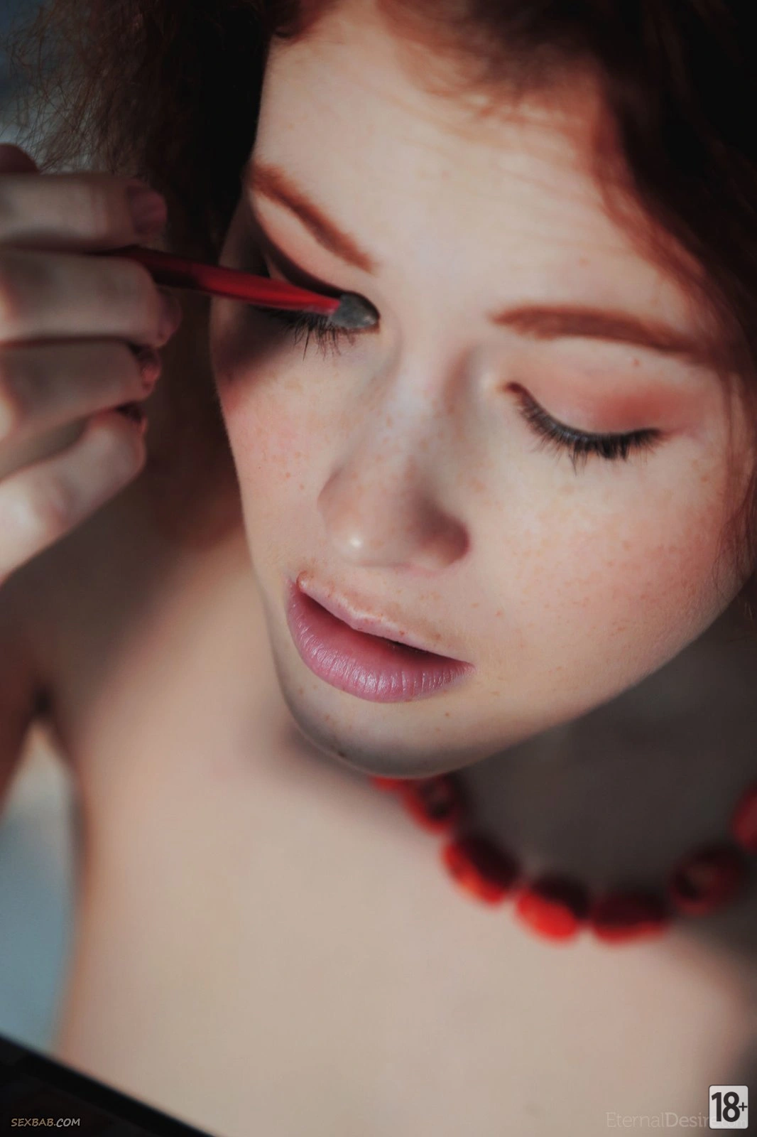 Девушка в колготках, без нижнего белья, устраивается на кровати. В какой-то момент она полностью раздевается и, раздвинув ноги, начинает ласкать себя. При этом она совсем не стесняется фотографа, который смотрит на неё с восхищением.