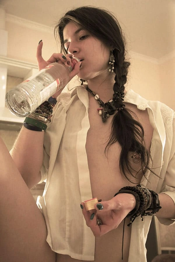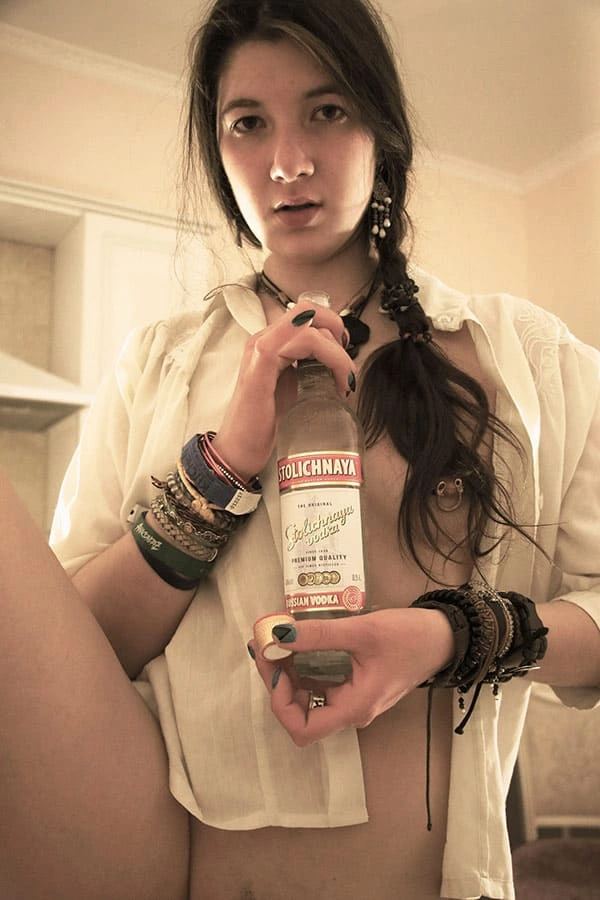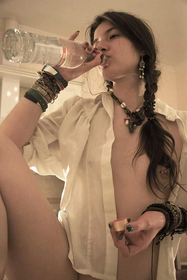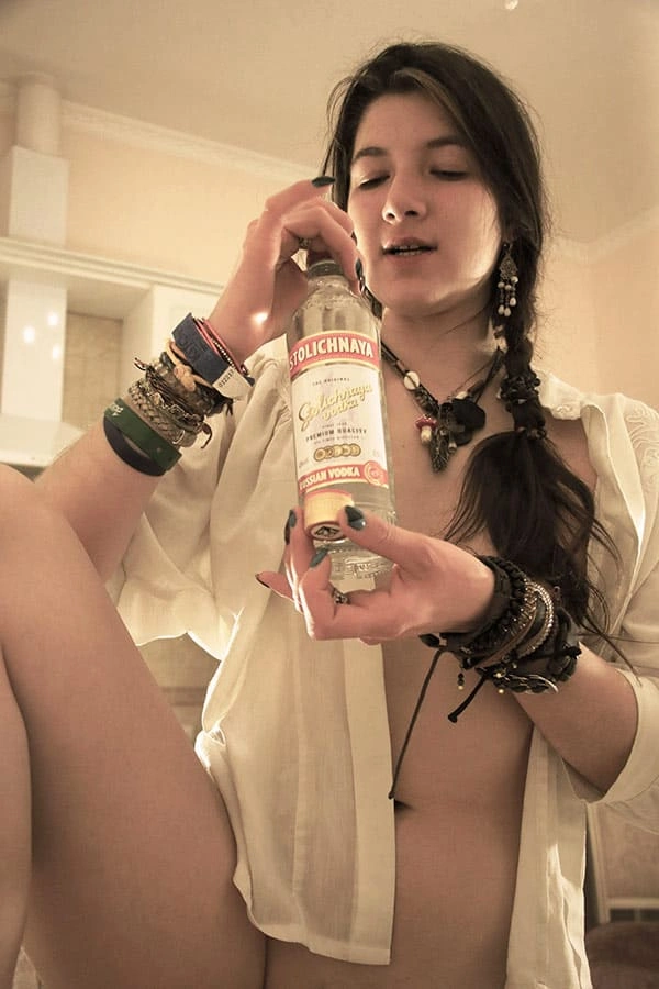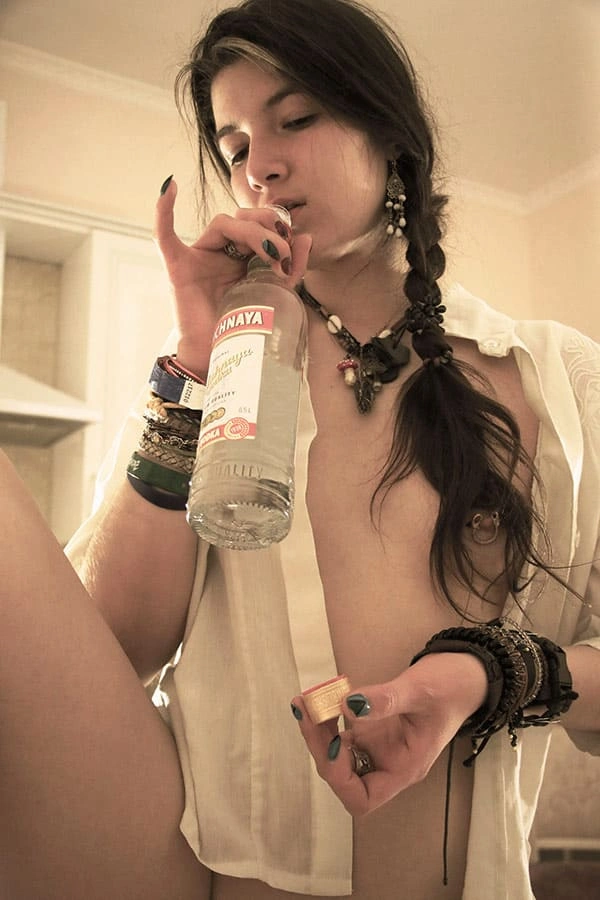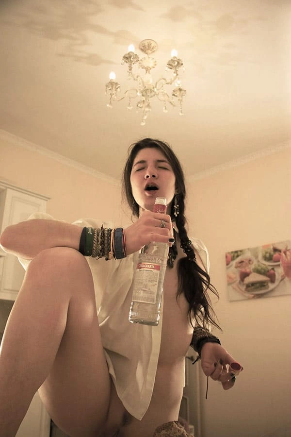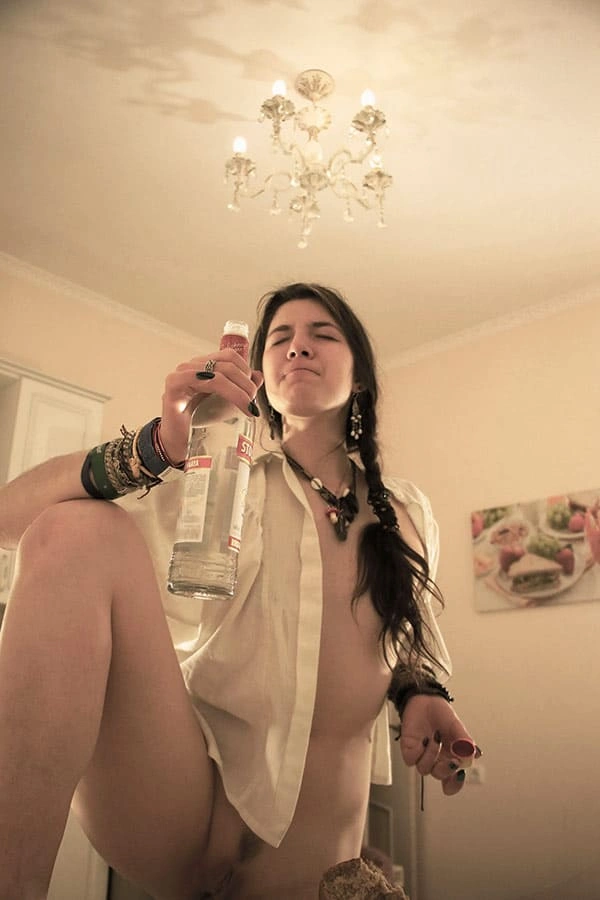 Молоденькая обнаженная красотка, с горящими глазами и знойными формами, наслаждается водочным напитком, наливая его прямо в свое изящное горло. Ее чувственные губы тянутся к бутылке, словно к поцелую, а ее гибкая шея изогнута в изящной позе. Она не нуждается в трусиках, ведь ее стройные ножки и так открыты для похотливых взглядов. Каждая капля водки, омывая ее горячее тело, лишь усиливает ее возбуждение и желание погрузиться в мир наслаждения и страсти.
