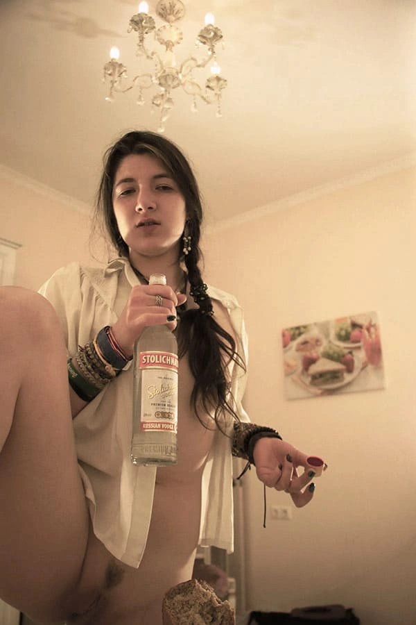 Голая брюнетка пьет водку из горла ( 21 фото )