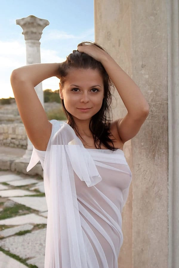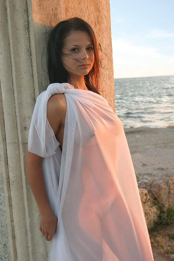 Ню съемка девушки в прозрачной греческой тунике