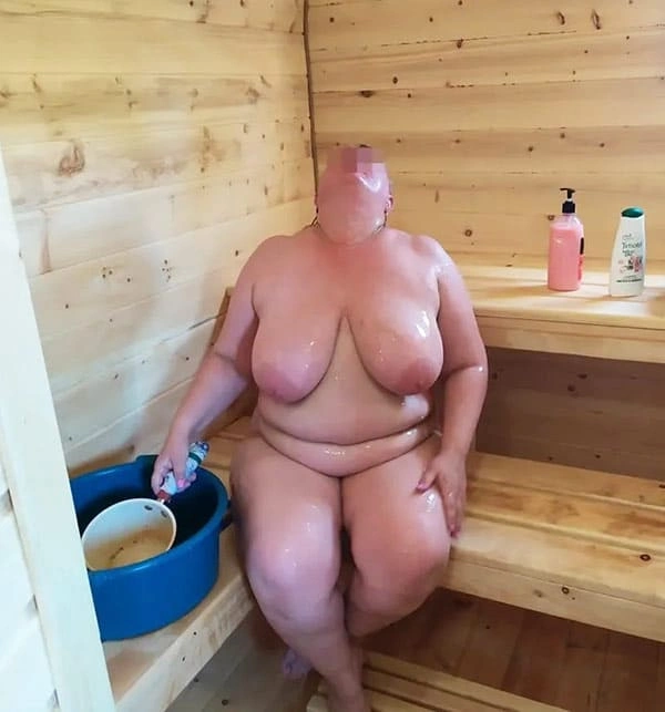 Пришедшие из домашнего архива снимки обнаженной пышной бабы, погруженной в атмосферу бани, сладостно омывающей свои прелестные груди и пышную попу потом.