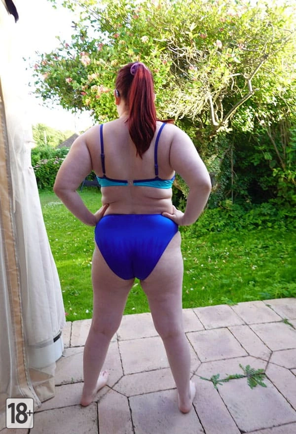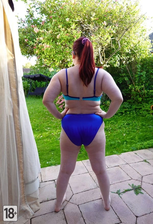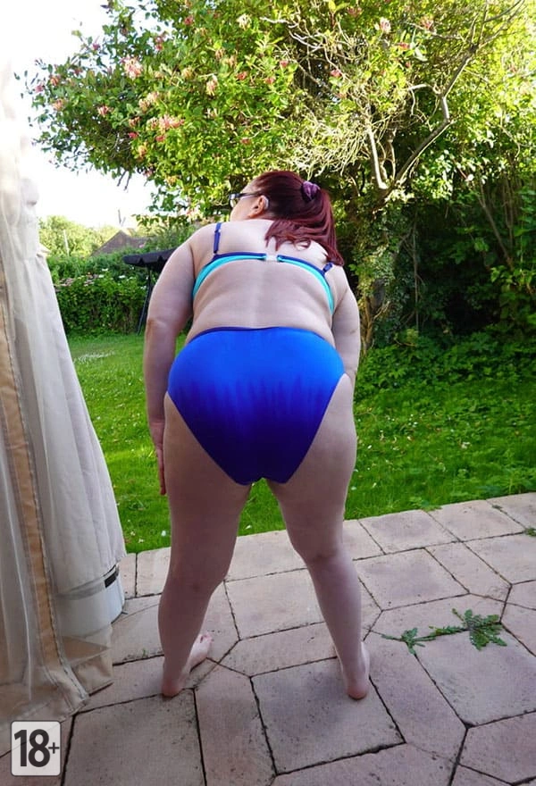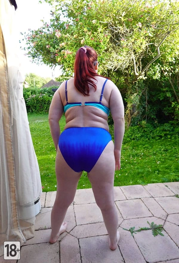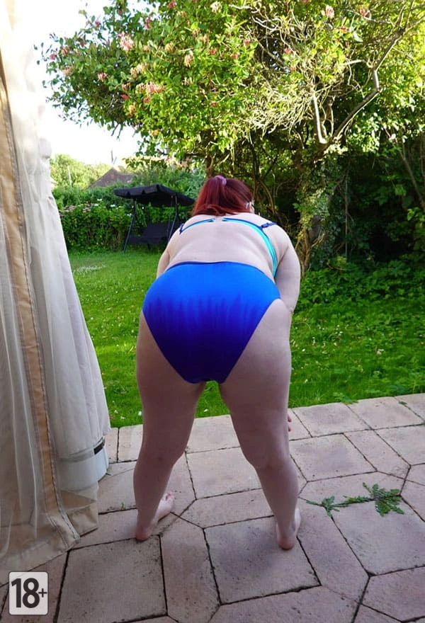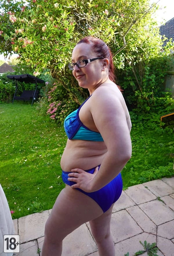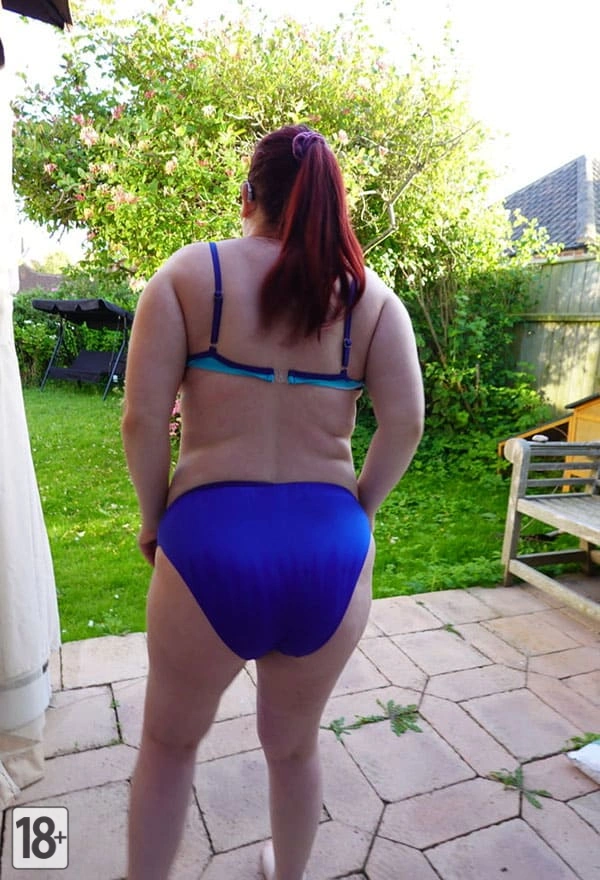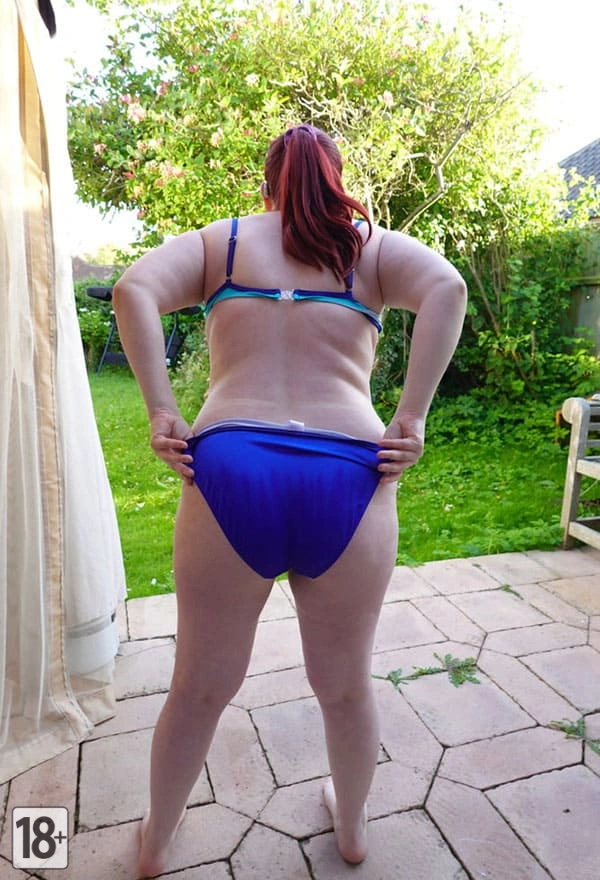 Толстая женщина с рыжими волосами в купальнике на дачном участке