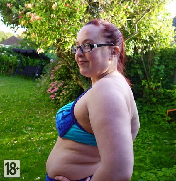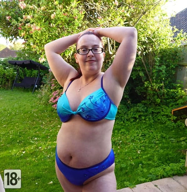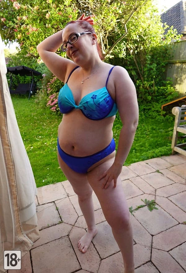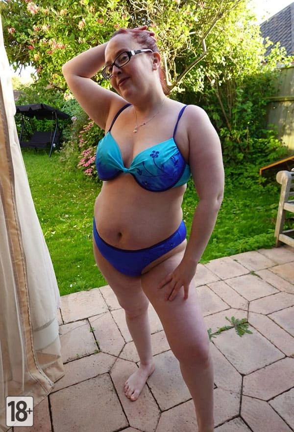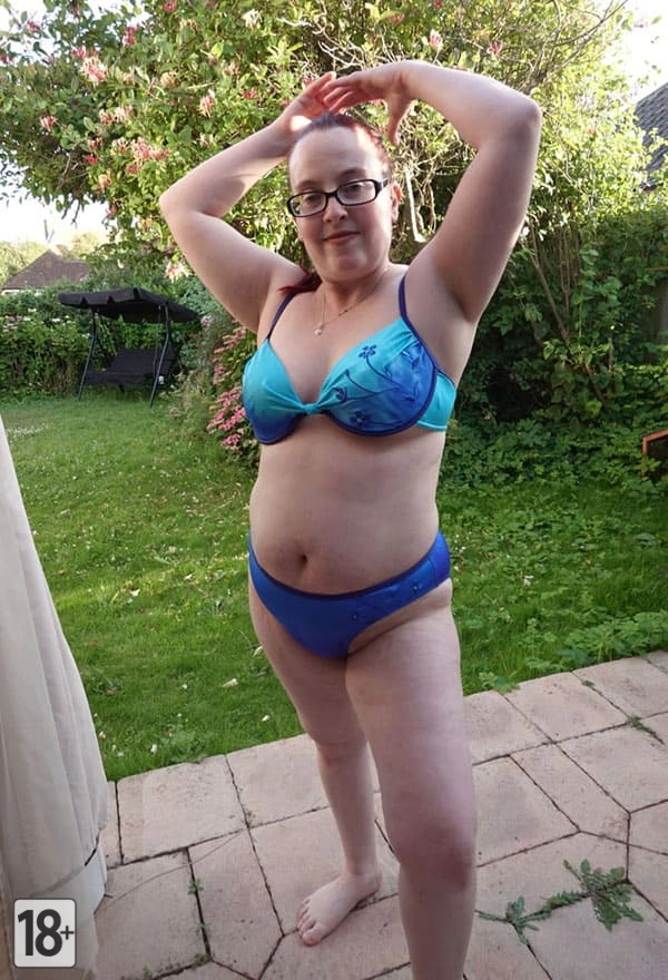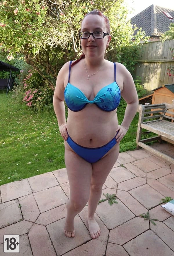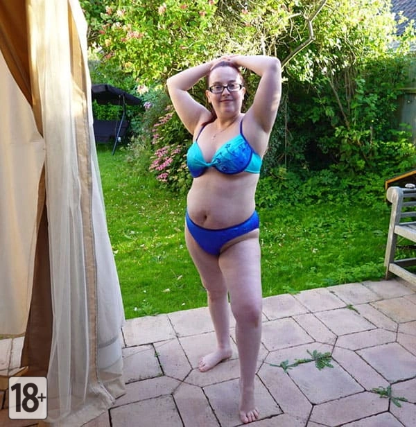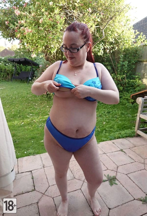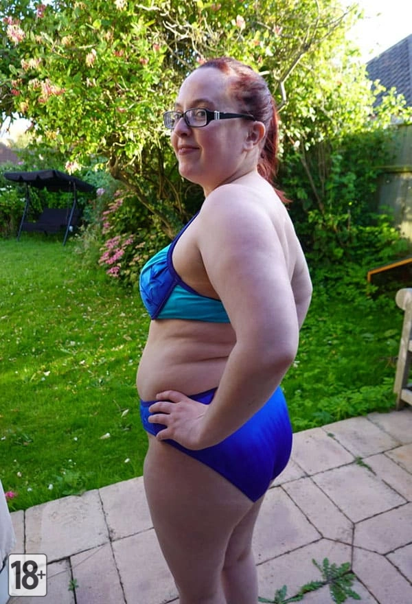 Толстая женщина с рыжими волосами в купальнике на дачном участке