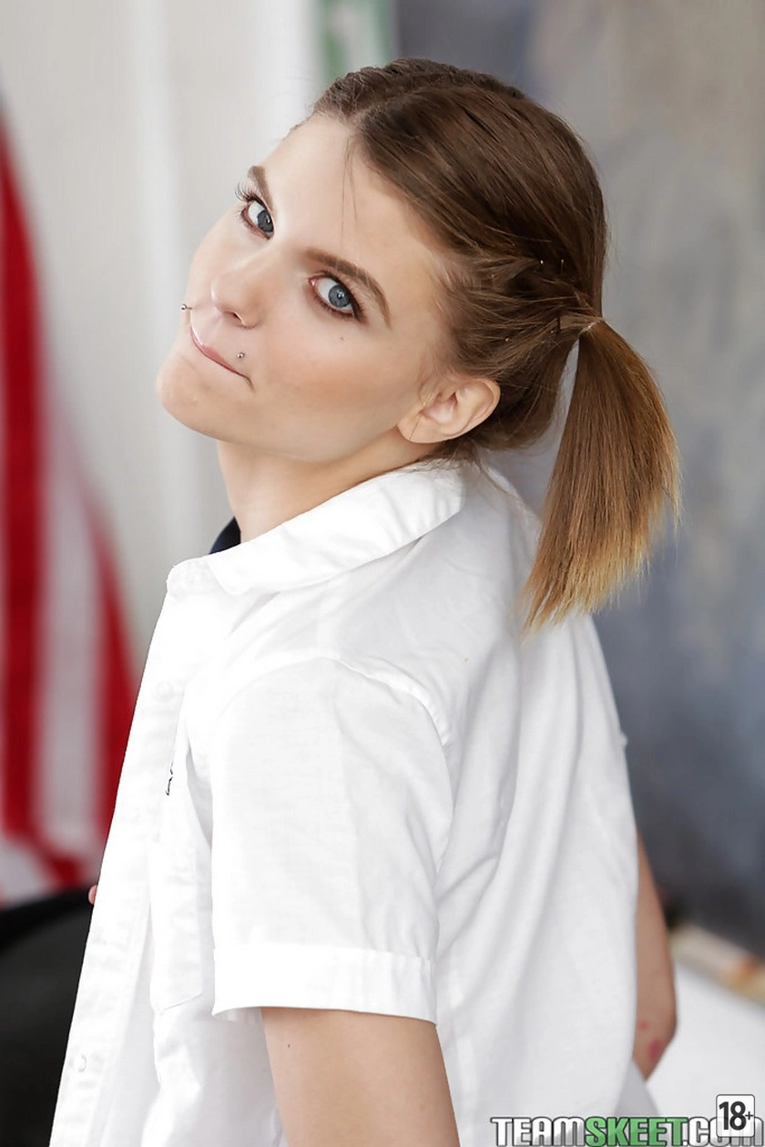 Фото худенькой студентки, которая зажигает стриптиз в пустом классе, сбрасывая шмотки и оголяя свои маленькие титьки. Смотри, как она вертит тощей жопкой, раздвигая ножки и демонстрируя гладко выбритую письку – чистый соблазн для тех, кто любит стройных красоток в такой развратной обстановке!