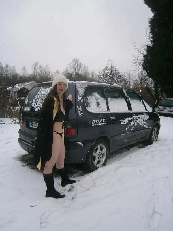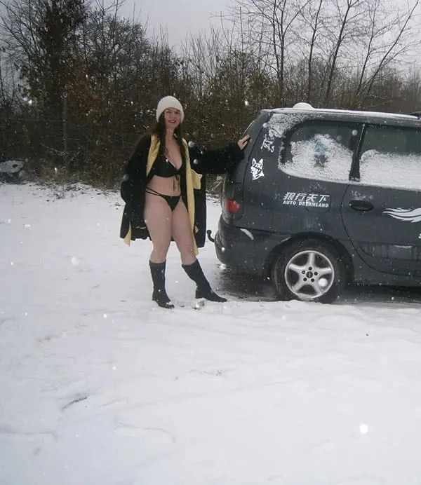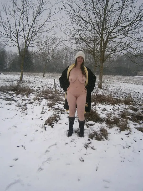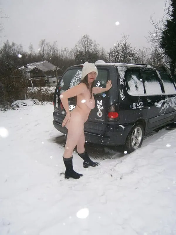 Обнаженная супруга на морозном дворе выставляет на показ свою смачную попку в стиле любительской эротики.