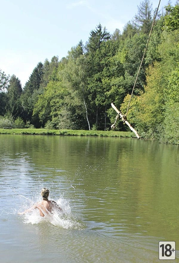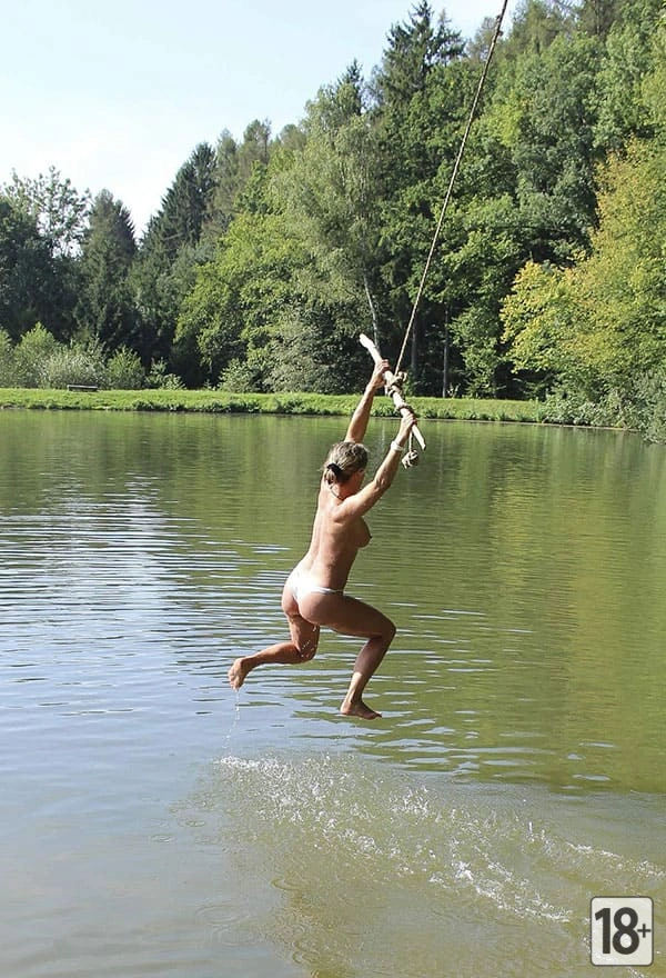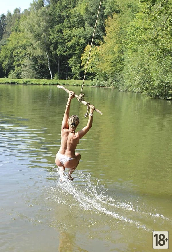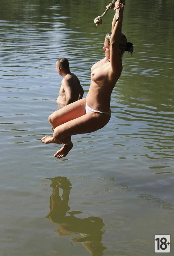 Фото: женщина-нудистка весело ныряет с тарзанки в озеро.
