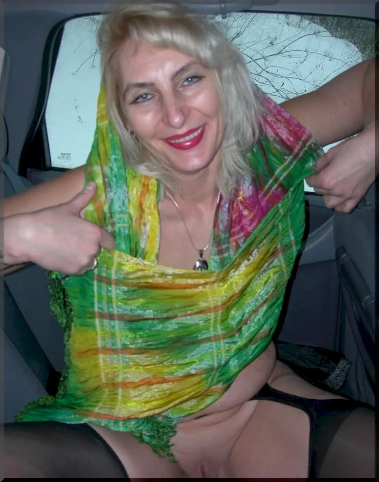 Жена в чулках, но без трусов, позирует в машине (14 фото)