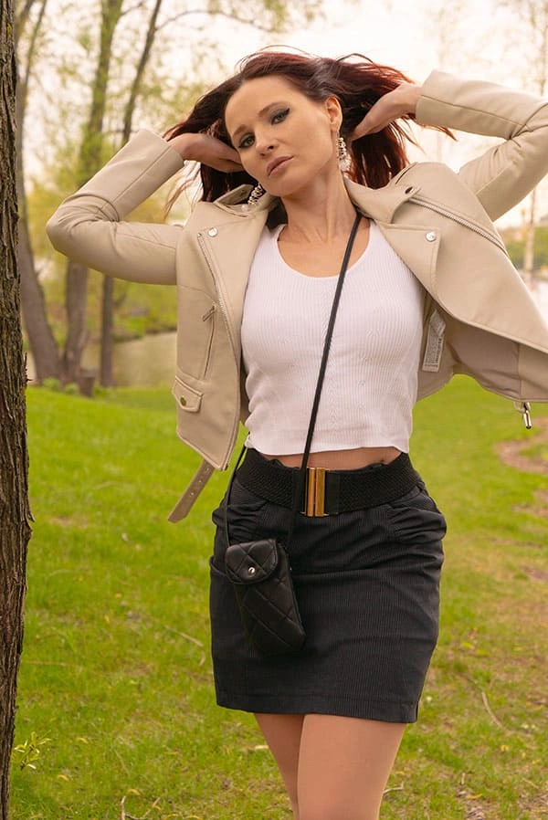 Девушка гуляет по парку в чулках и мини юбке ( 17 фото )