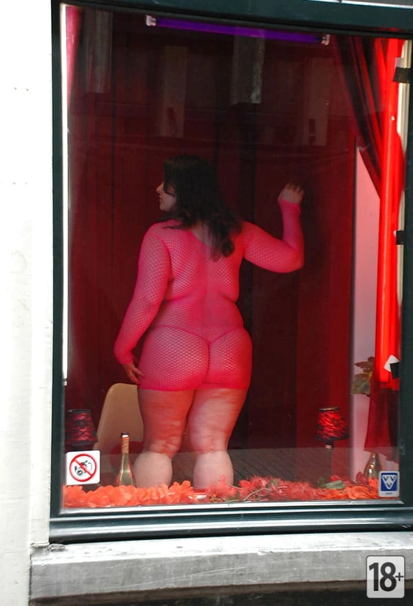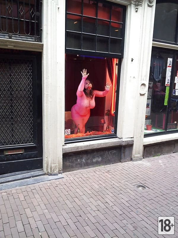 На витрине борделя проститутка привлекает внимание прохожих, приглашая их зайти внутрь.