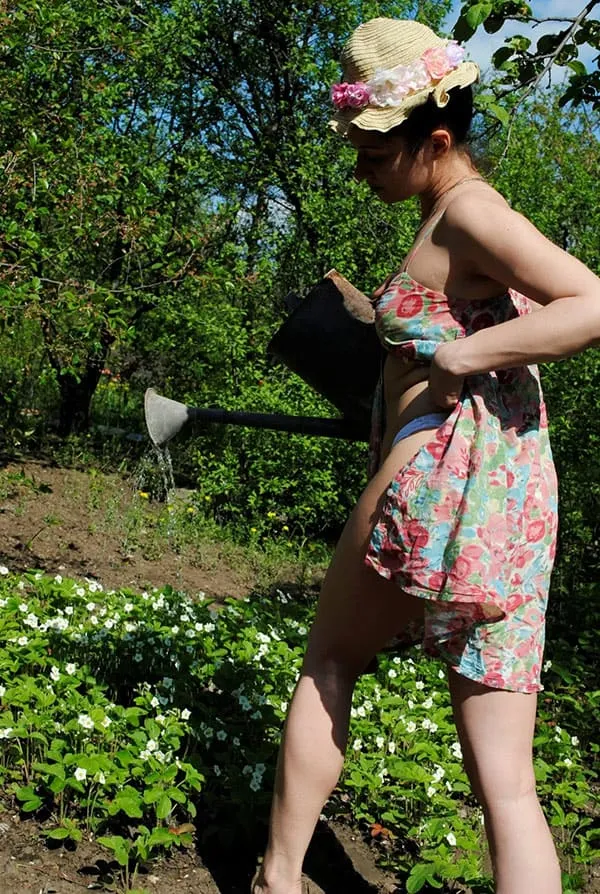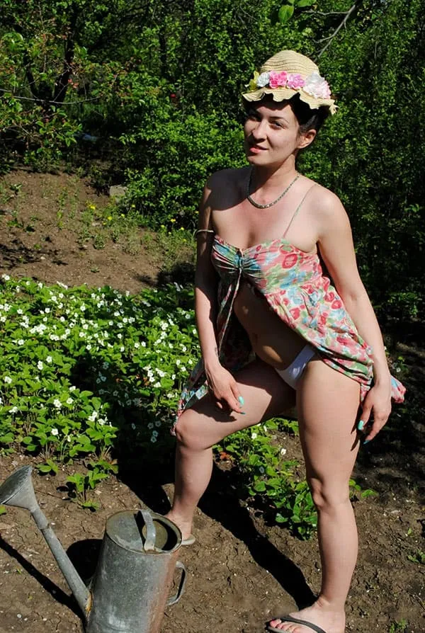 Молодая дачница, её тело золотит солнце, работает в огороде голая. Каждый её движение, нежный и грациозный, заставляет сердце биться быстрее. Её руки, покрытые землей, ласкают растения, а её дыхание, легкое и стремительное, сливается с звуками природы. Каждый касание листьев и земли добавляет в её взгляд огонёк жажды, а солнце, окутывая её фигуру, создаёт игру теней, которая завораживает взгляд. Она чувствует себя свободной и неудержимой, как если бы природа сама её обняла, и её улыбка, полная тайн и намёков, приглашает к игре, полной страсти и вдохновения.