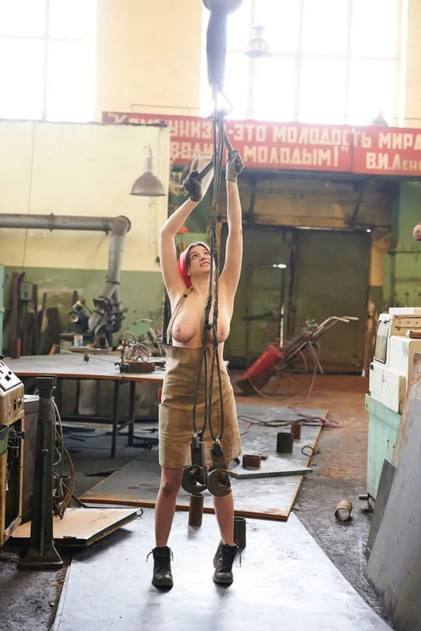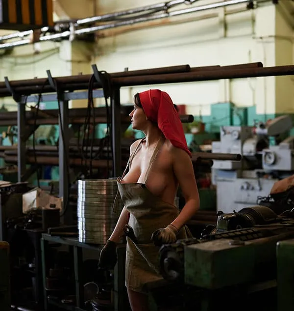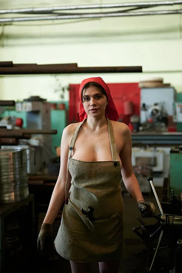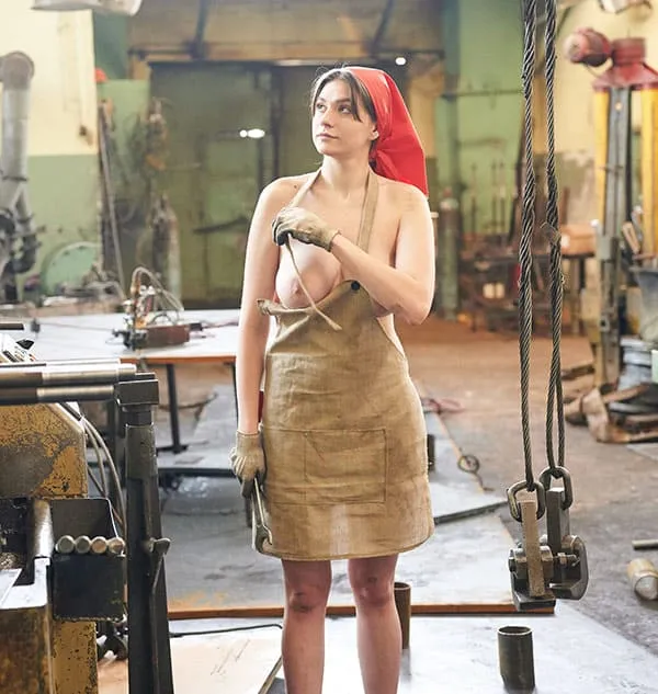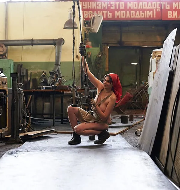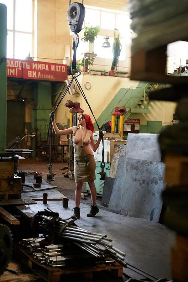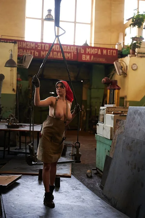 Обнаженная женщины, трудящаяся на промышленном предприятии в эпоху Советского Союза, позирует для фото в своей непристойной обнаженности. Ее стройное тело, покрытое пылью и грязью от работы, притягивает взгляды и вызывает желание у мужчин. Она не стесняется своей сексуальности, наоборот, гордится ею, ведь она является не только трудолюбивой рабочей, но и соблазнительной и сексуальной женщиной. Ее глаза исступленно смотрят в объектив камеры, словно призывая к себе, а ее губы словно спелая клубника.