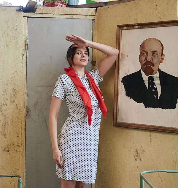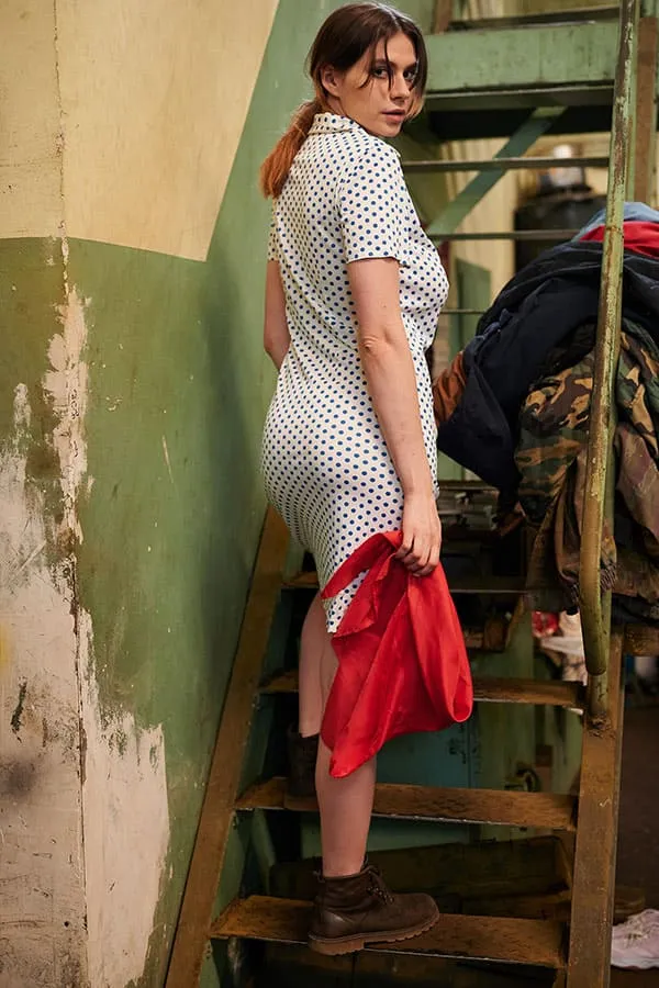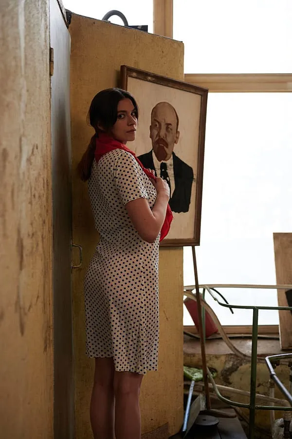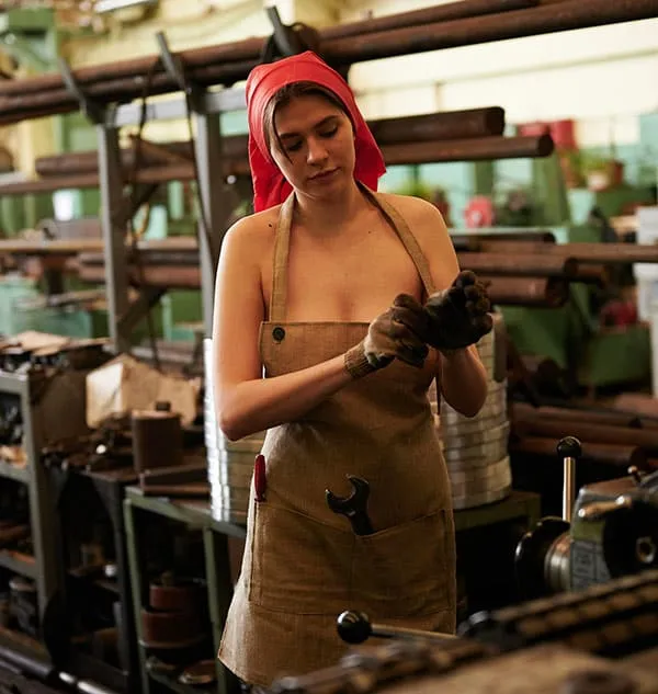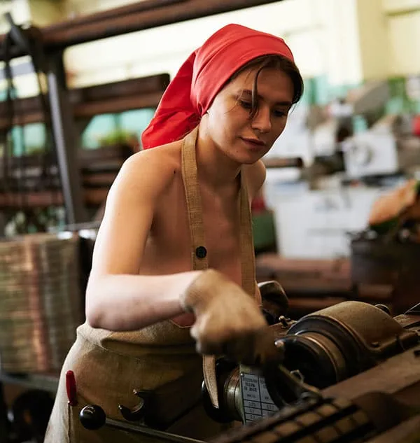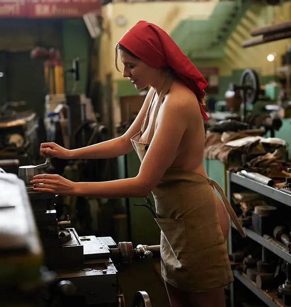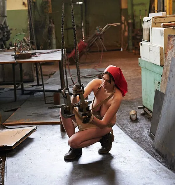 Обнаженная женщины, трудящаяся на промышленном предприятии в эпоху Советского Союза, позирует для фото в своей непристойной обнаженности. Ее стройное тело, покрытое пылью и грязью от работы, притягивает взгляды и вызывает желание у мужчин. Она не стесняется своей сексуальности, наоборот, гордится ею, ведь она является не только трудолюбивой рабочей, но и соблазнительной и сексуальной женщиной. Ее глаза исступленно смотрят в объектив камеры, словно призывая к себе, а ее губы словно спелая клубника.