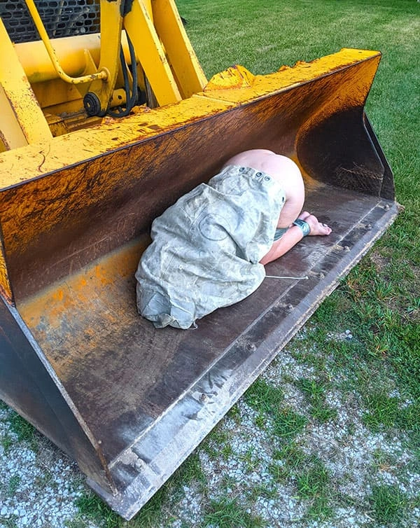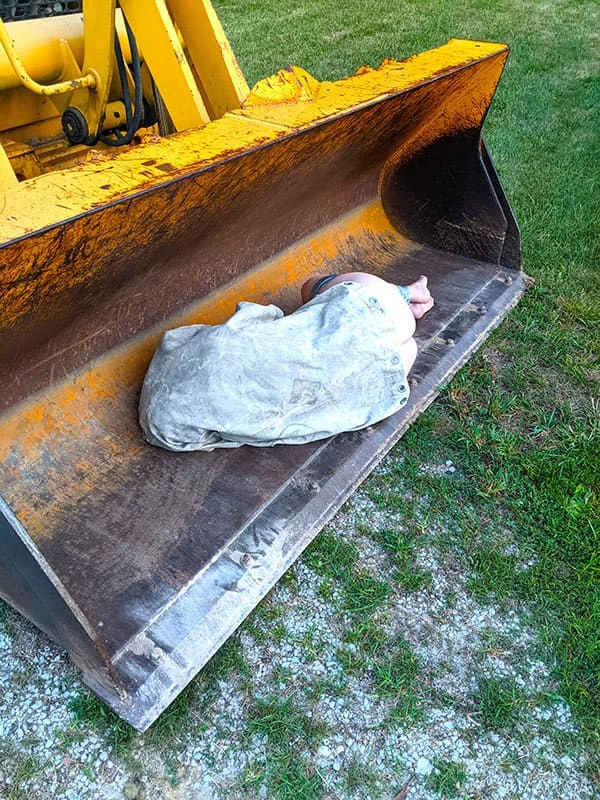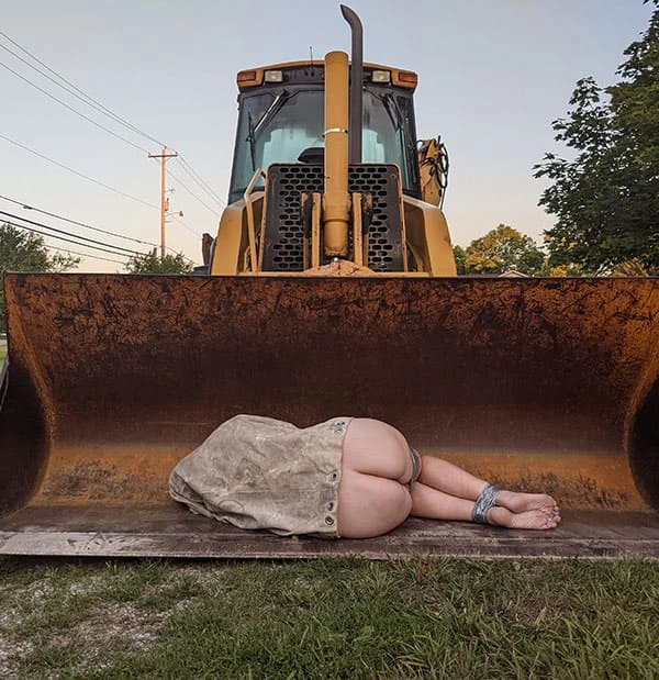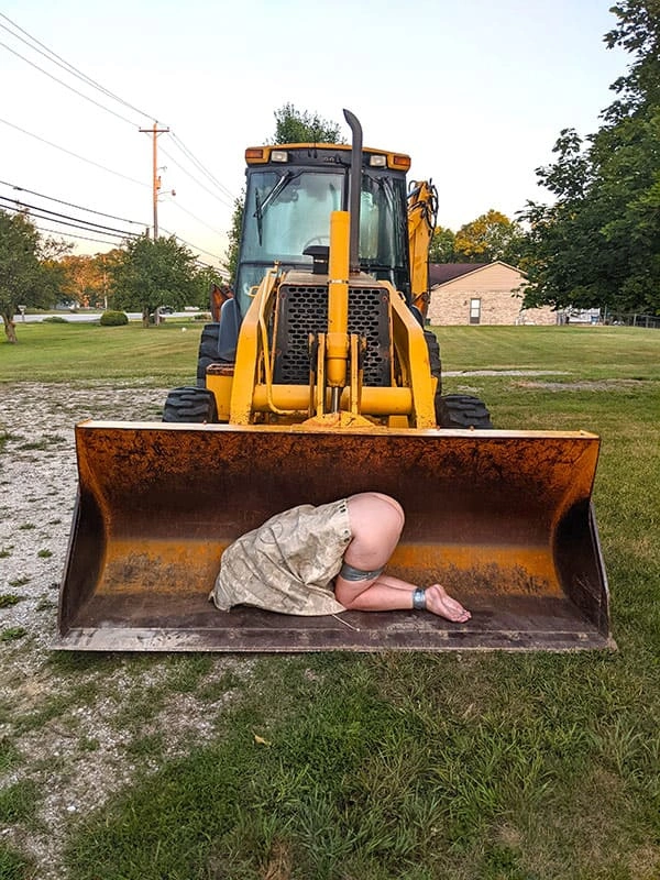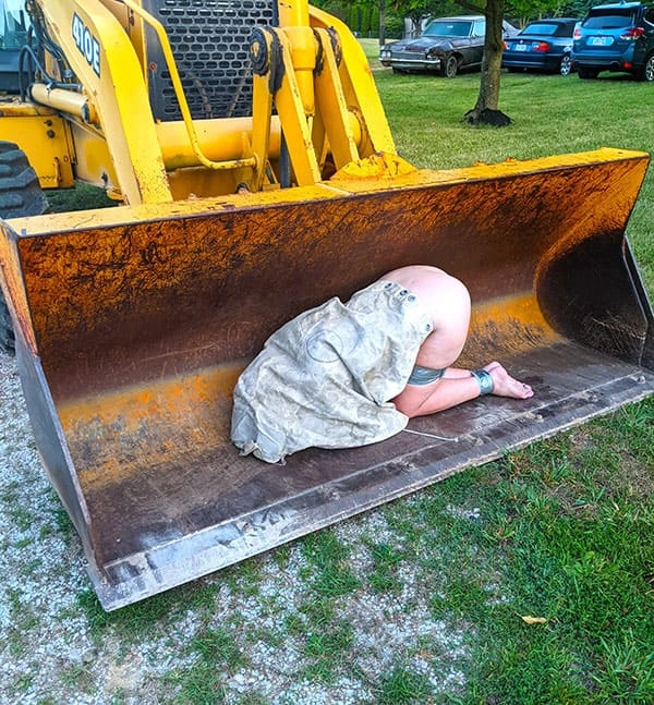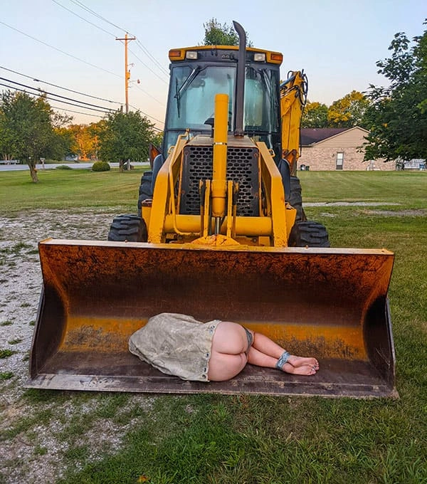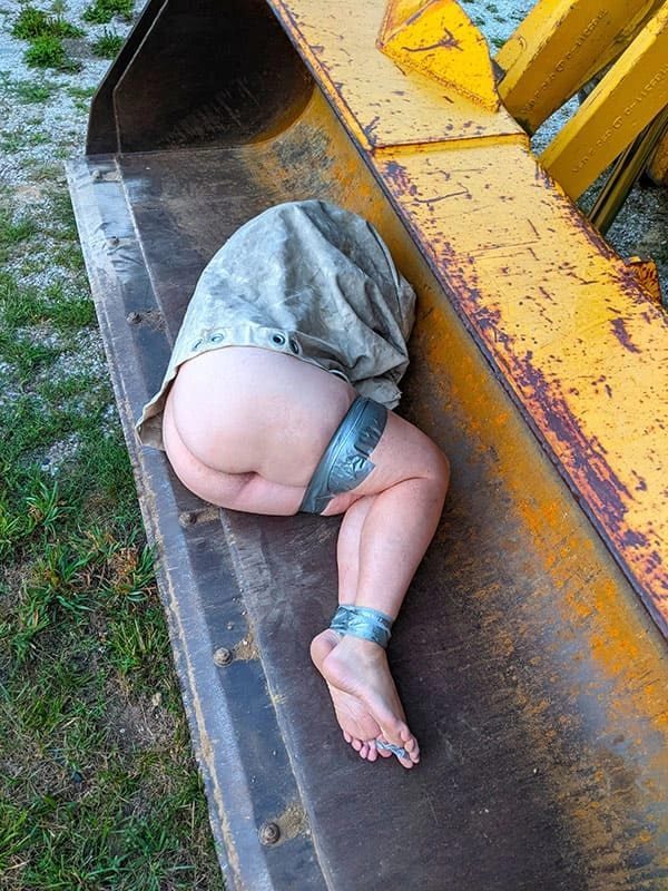 Страстный крестьянин, управляя мощным трактором, мчался по деревенским дорогам, везя в своем ковше горячую супругу, обнаженную и связанную скотчем в позе жгучего рака. Она визжала от удовольствия, наслаждаясь дикой ездой и ощущая, как каждый бугорок и неровность дороги приносит ей невероятное наслаждение. Жаркий ветерок ласкал ее обнаженное тело, а зрители на обочине не могли отвести глаз от этой сцены, полной страсти и желания.
