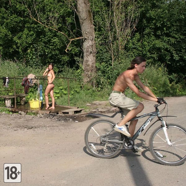 Голая девушка у водяной колонки в деревне