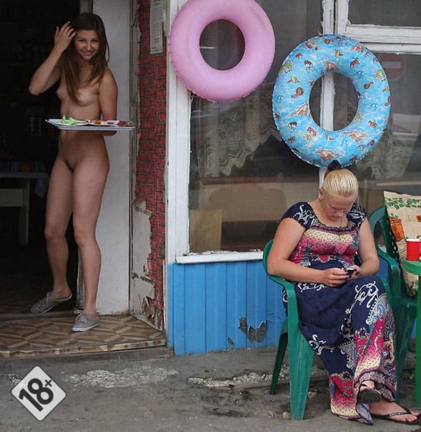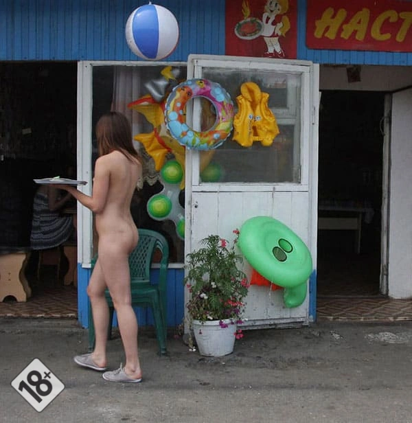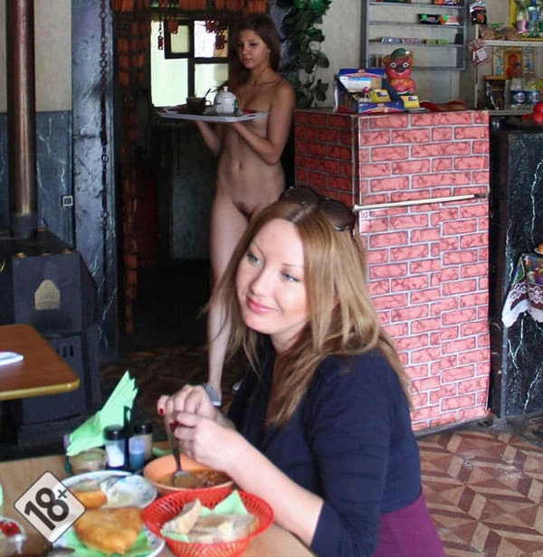 Официантка в кафе обслуживает голой посетителей