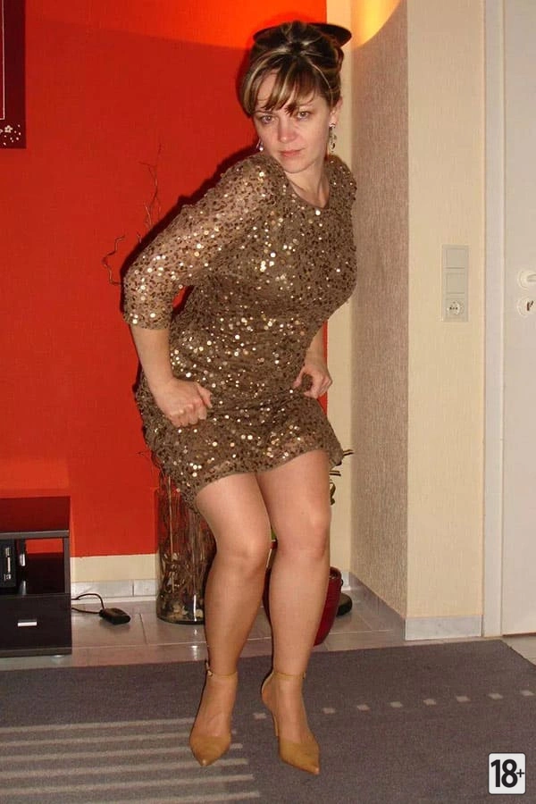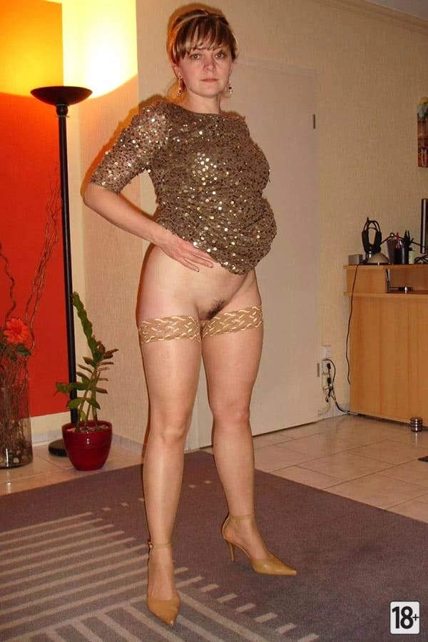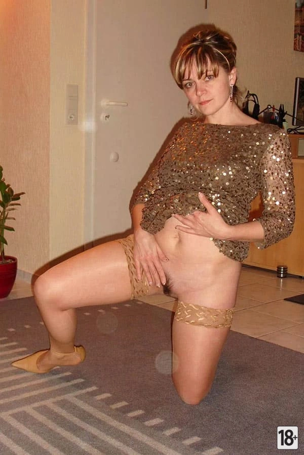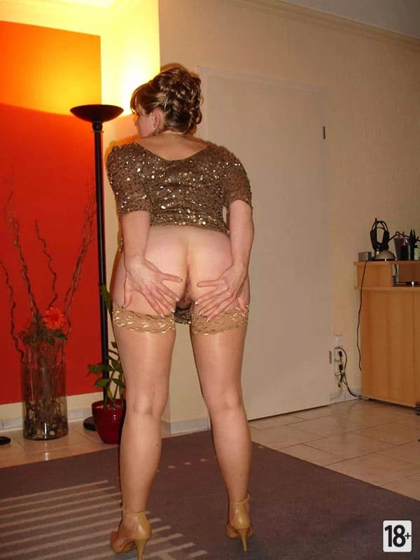 Фото праздничной жены в элегантном вечернем платье и чулках. Она игриво задрала подол, открыв ухоженную, аккуратно подстриженную прелесть без единого намёка на бельё. Такая соблазнительная сюрприз под нарядом заводит до предела!