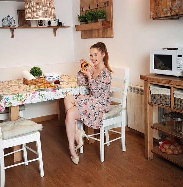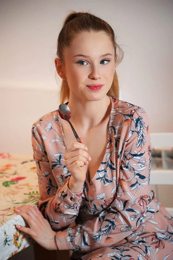 Молодая хозяйка с удовольствием взбивала тесто для оладий на плите, приготовляя сладкие угощения для своего возлюбленного. Но после того, как они насладились обедом, она неожиданно сняла с себя все одежды, рассекретив свои прелестные формы на кухонном столе. Ее горячее тело было полностью обнажено, и ее гладкая кожа манила к прикосновениям. Она сидела там, с раскрытой нежной киской, приглашая своего партнера насладиться ее сладкими удовольствиями. Это был идеальный обед для двоих, полный страсти и наслаждения.