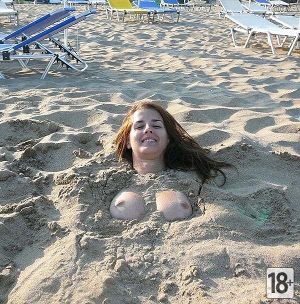 Вот такие вот у нас красавицы на пляже! А не то, что всякие приличные там ходят, хоть сиськи и не показывают. Ну а эта девочка совсем наглец - прямо нарочно свои прелести показывает. Но мы ее не обидим, а просто похороним в песке, чтобы она больше не высовывалась. А то еще кто-то может увидеть и сделать ей предложение, а мы же не хотим, чтобы наша красотка ушла к кому-то другому!