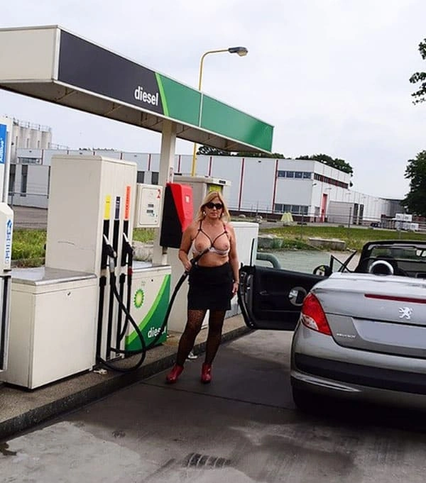 Обнаженная соблазнительница в возрасте, восхищает взгляды своими ножками в чулках и силиконовыми грудями. Ее роскошное тело сияет на солнце, когда она с уверенностью вставляет топливный шланг в свой роскошный мерседес кабриолет. Ее движения грациозны и чувственны, словно она играет с машиной в эротическую игру, наполняя ее жаждой и страстью. На заправке она не только наполняет свой автомобиль, но и свою душу, наслаждаясь каждым мгновением и оставляя за собой следы оргазма.